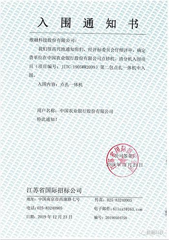 近日,維融科技股份有限公司收到江蘇省國際招標(biāo)公司發(fā)出的《中國農(nóng)行股份有限公司點(diǎn)鈔機(jī)、清分機(jī)入圍通知書》(項(xiàng)目編號(hào):JITC-1905WW2099),確定維融科技中標(biāo),中標(biāo)產(chǎn)品包括:人民幣點(diǎn)鈔機(jī)、點(diǎn)扎一體機(jī)。 維...