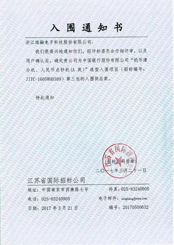 近日,我公司收到江蘇省國際招標公司發出的《入圍通知書》。在中國銀行股份有限公司“紙幣清分機、人民幣點鈔機(A類)”選型入圍項目(招標編號:JITC-1605WH0389)中,經評標委員會仔細審查,以及用戶確認后,確定維融科技股份有限公司為第三包的入圍供應商,入圍產品為紙幣清分機、人民幣點鈔機(A類) 。