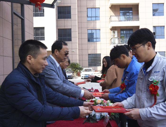 接著,主持人宣讀《維融股份公司關于2017年評優結果的通報》。會議表彰了23名優秀員工。公司高層管理人員為獲獎員工頒發了榮譽證書和獎金。接著,兩位員工錢靜、蘇孝永作為優秀員工代表上臺發言。獲獎代表們對所獲的榮譽表達感激,也表示今后會珍惜榮譽、戒驕戒躁,在新一年里為公司轉型升級貢獻力量。