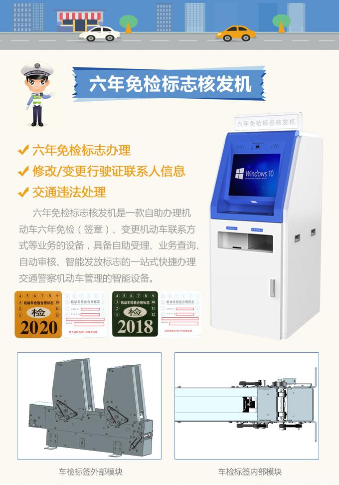 六年免檢標志核發機是一款自助辦理機動車六年免檢(簽章)、變更機動車聯系方式等業務的設備,具有自動受理、業務查詢、自動審核、智能發放標志的一站式快捷辦理交通警察機動車管理的智能設備。
