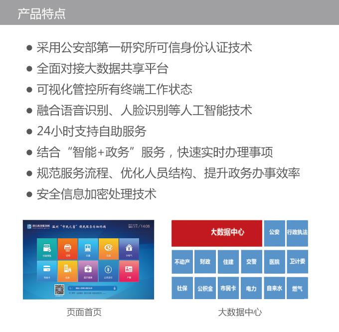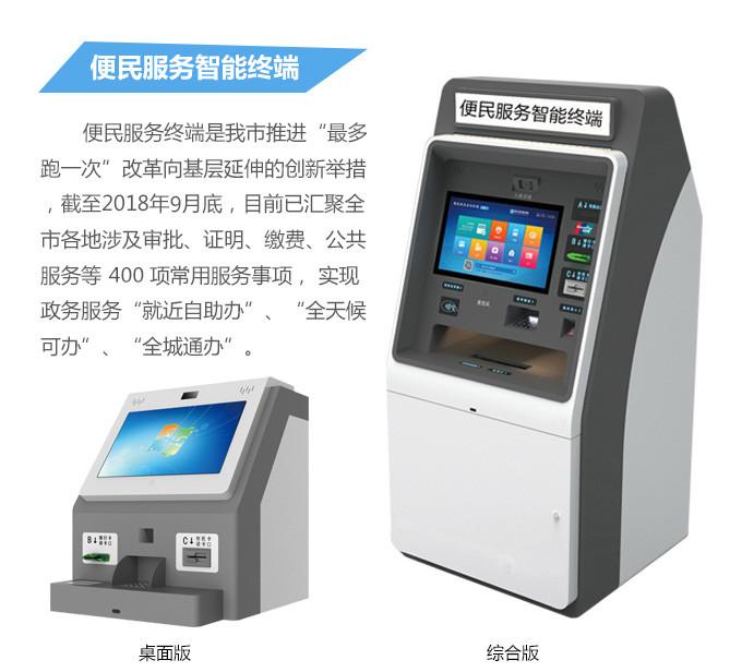 便民服務智能終端,是采用”硬件+應用+管控”的模式運行。設備端配有高拍儀、打印機、觸摸顯示屏、身份證讀卡器、社保卡讀卡器、憑條打印機、二維碼、智能語音等模塊,集成整合實現數據的驗證、采集、審批、發送等一系列功能。現可實現400項政務事項辦理通道,后續將計劃完成500多項業務類型,業務涉及部門包含:公安、行政執法、不動產、財政、住建、交警、衛計委、社保、公積金、市民卡、電力、自來水、燃氣等。業務類型,如審批申報、證明打印、水電氣繳納、交通違法繳費、醫療預約掛號、住房、社保、市民卡信息查詢、公共支付、公安等。