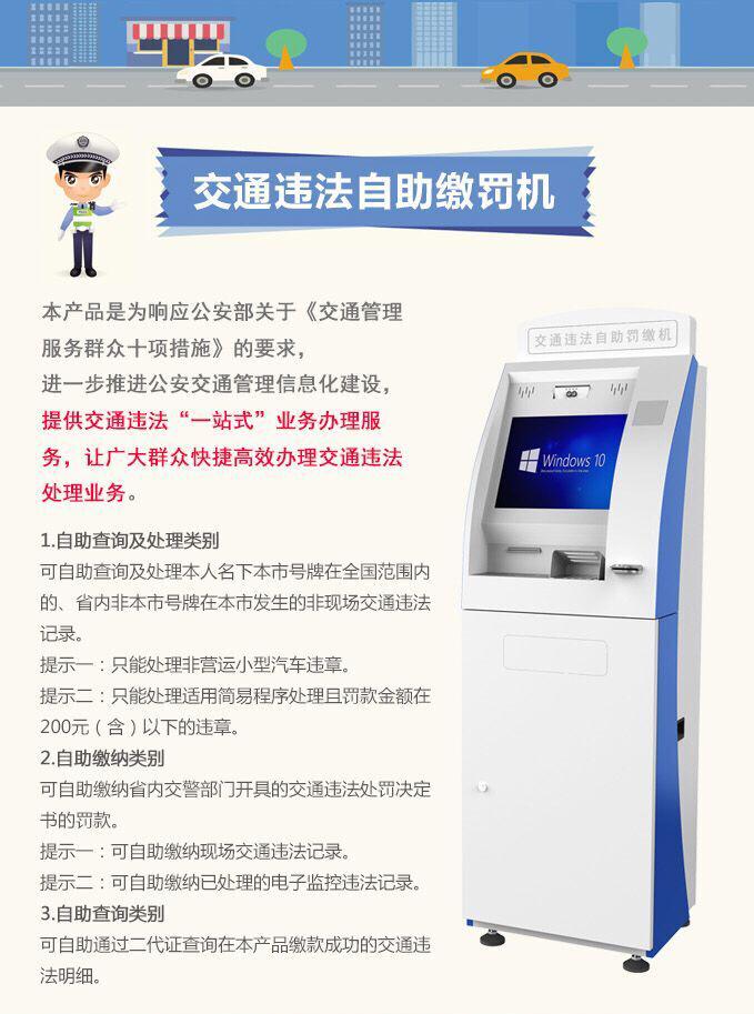 為進一步推進公安交通管理信息化建設,提高服務水平,維融科技響應公安部關于《交通管理服務群眾十項措施》的需求,自主研發交通違法自助繳納機,向廣大市民提供交通違法業務辦理,包括交通違法查詢、交通違法確認、交通罰款繳納等。