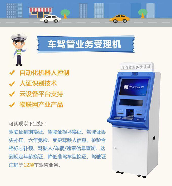 車駕管業務受理機集合人臉識別、后臺數據比對、AI智能審核等功能于一體,實現自助式打印、塑封、出證。可自助辦理駕駛證到期換證、駕駛證損壞換證、駕駛證丟失補正、六年免檢、變更駕駛人信息、檢驗合格標志補領、駕駛人/車輛/違章信息查詢、達到規定年齡換證、降低準駕車型換證、駕駛證注銷等12項車駕管業務。