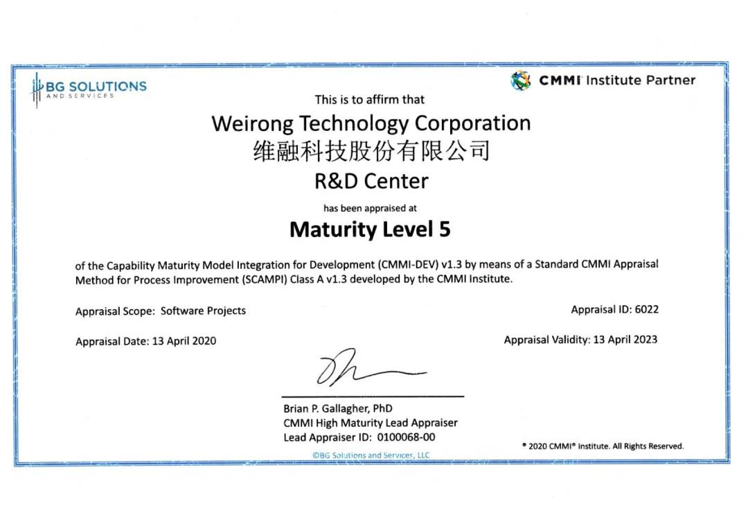 2020年4月13日,維融科技股份有限公司正式通過CMMI5級評估認(rèn)證,標(biāo)志著公司在軟件過程組織、技術(shù)研發(fā)、項(xiàng)目管理、方案交付等方面達(dá)到了國際先進(jìn)水平。?